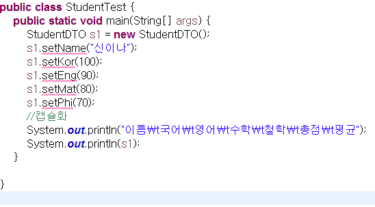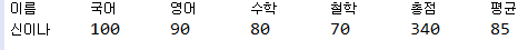 System.out.println("이름\t국어\t영어\t수학\t철학\t총점\t평균");