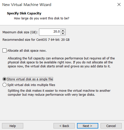 N. S/W disk size 는 20G -> Single file로 생성한다.