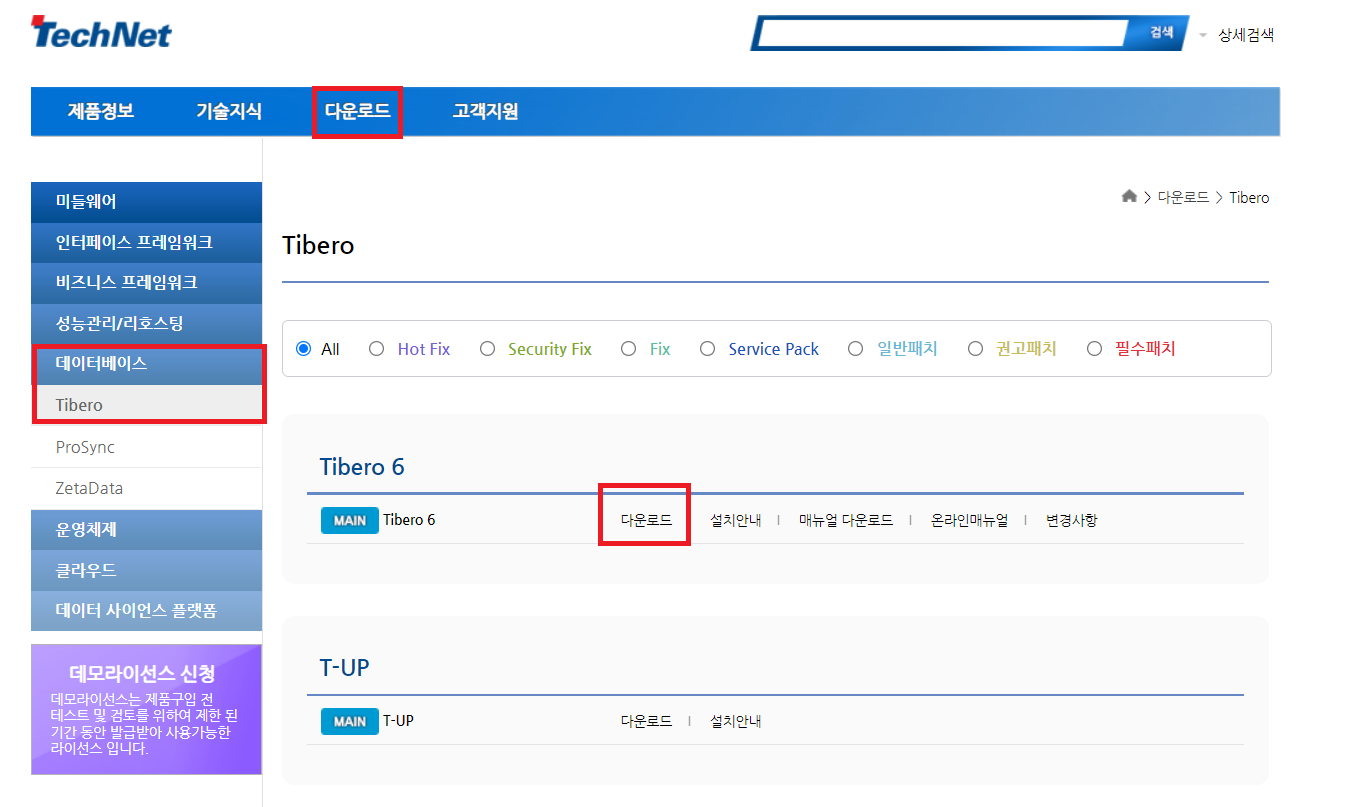 다운로드 - 데이터베이스 - Tibero - 다운로드 ( Tibero 받으려면 로그인 필요)